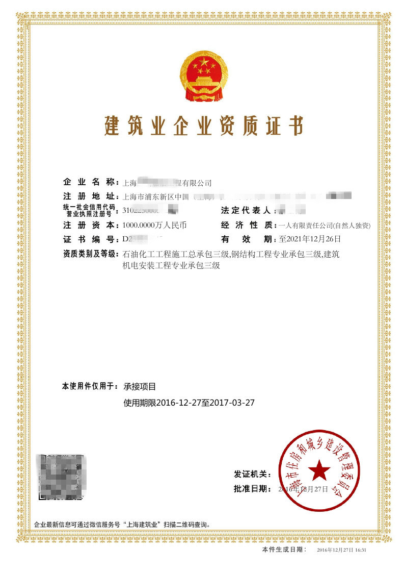 资质证书:石油化工工程施工总承包三级,钢结构工程专业承包三级,建筑机电安装工程专业承包三级