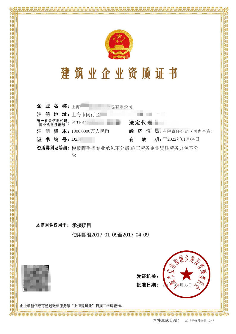 资质证书:模板脚手架专业承包不分级,施工劳务企业资质分包不分级