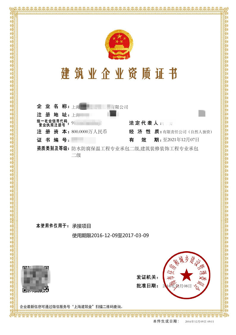 资质证书:防水防腐保温工程专业承包二级,建筑装修装饰工程专业承包二级