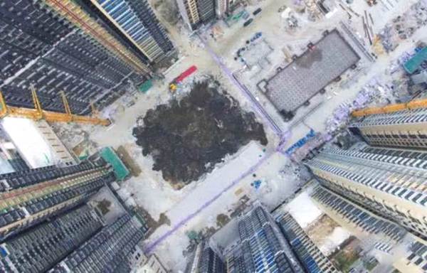 航拍图片显示,原本应为平整的地下室顶板,因坍塌形成了褐黑色的方形区域,临近的三面建筑是在建住宅。