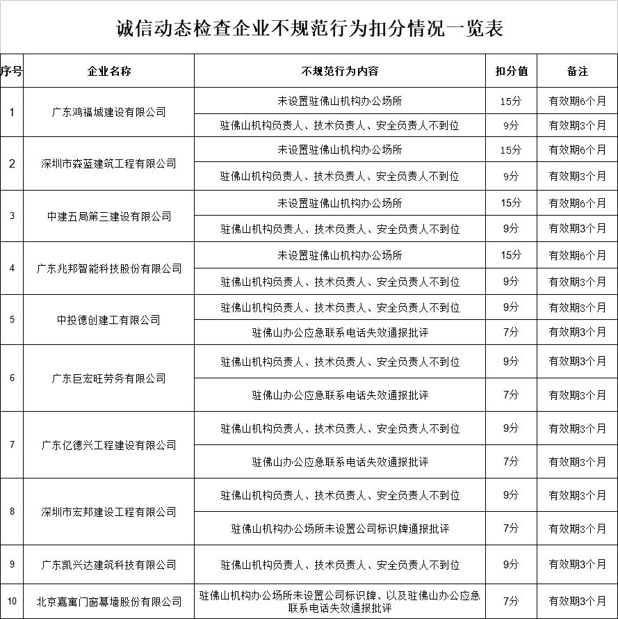 对本次动态核查中,企业未按要求设置办公场所、相关管理人员没有到位履职、实际情况与诚信登记信息不符,未设置必备设施的,根据《佛山市住房和城乡建设管理局建筑行业诚信管理办法》(佛建管〔2017〕53号)的规定,对其失信不规范行为进行相应的诚信扣分。具体扣分情况详见附件。