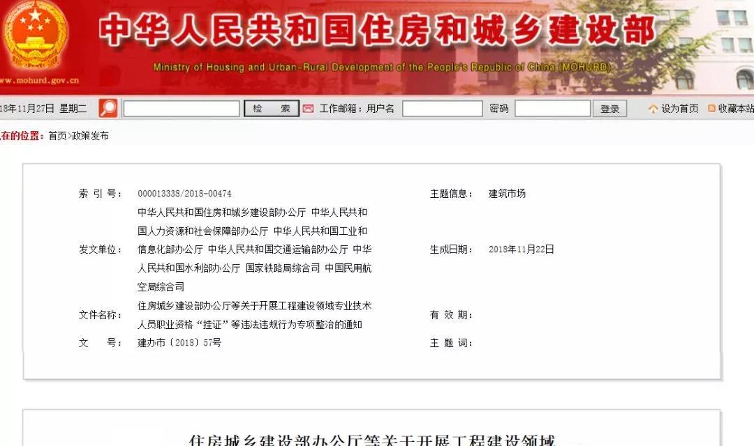 2018年11月22日,住房和城乡建设部等七部委发布《关于开展工程建设领域专业技术人员职业资格“挂证”等违法违规行为专项整治的通知》,正式拉开“挂证”专项整治序幕。这份史无前例的文件对挂靠相关主体乃至整个行业的影响甚大。