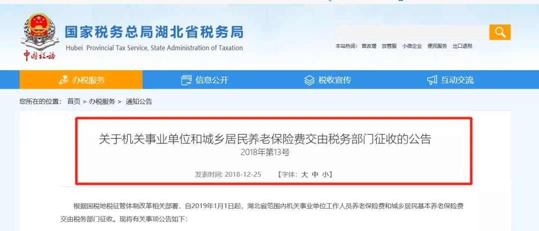 根据国税地税征管体制改革相关部署,自2019年1月1日起,湖北省范围内机关事业单位工作人员养老保险费和城乡居民基本养老保险费交由税务部门征收。现将有关事项公告如下: