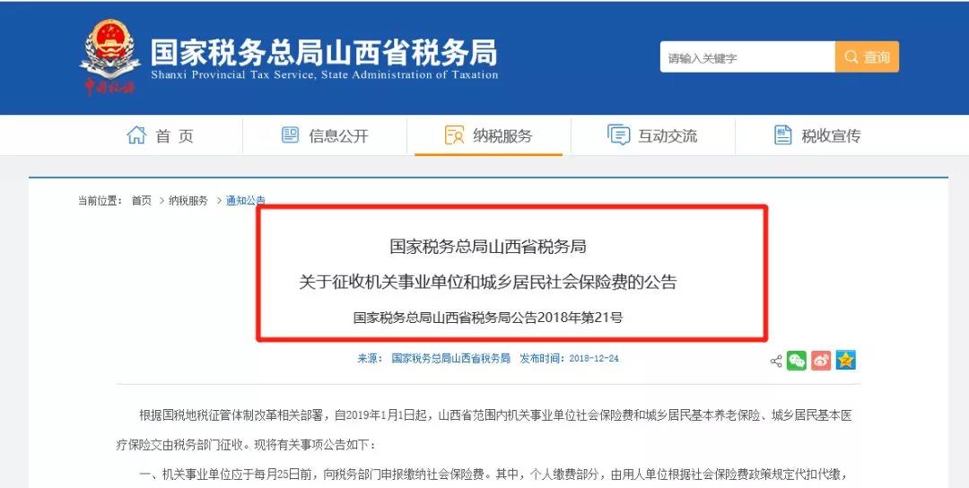 根据国税地税征管体制改革相关部署,自2019年1月1日起,山西省范围内机关事业单位社会保险费和城乡居民基本养老保险、城乡居民基本医疗保险交由税务部门征收。现将有关事项公告如下: