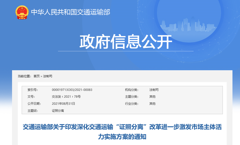近日,交通运输部印发《深化交通运输“证照分离”改革进一步激发市场主体活力实施方案》。