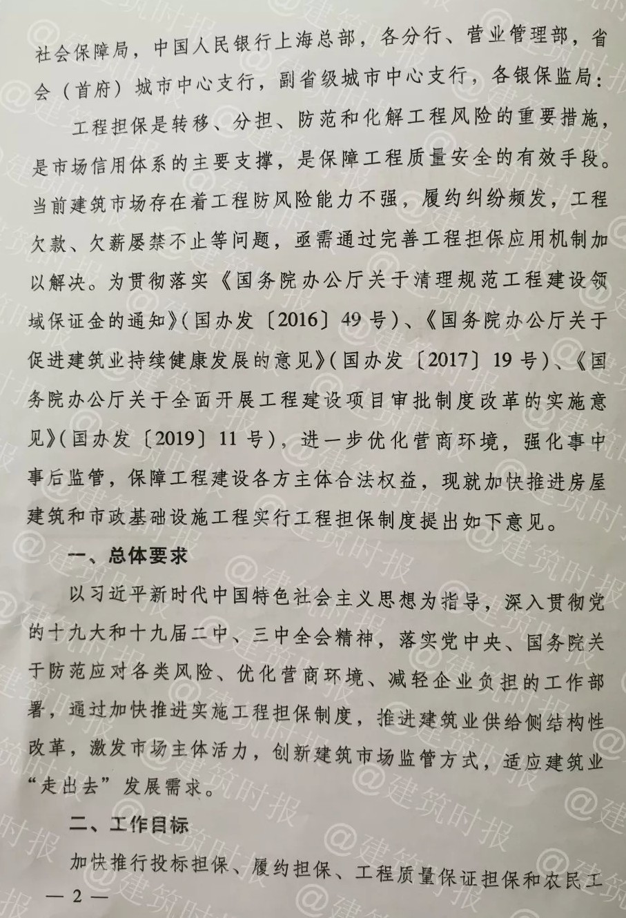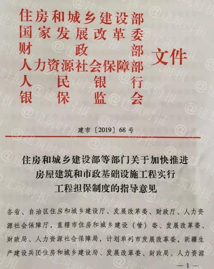 日前,住建部联合发改委、财政部、人社部、人民银行、银保监会共同发文(建市【2019】68号)加快推进房屋建筑和市政基础设施工程实行工程担保制度。
