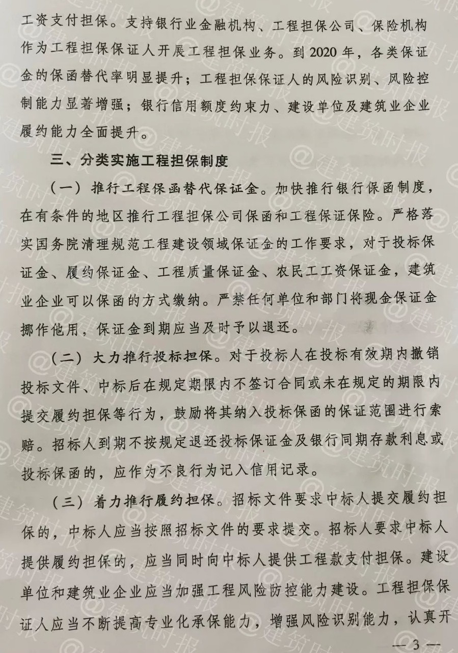 为贯彻落实《国务院办公厅关于清理规范工程建设领域保证金的通知》(国办发〔2016〕49号)、《国务院办公厅关于促进建筑业持续健康发展的意见》(国办发〔2017〕19号)、《国务院办公厅关于全面开展工程建设项目审批制度改革的实施意见》(国办发〔2019〕11号),进一步优化营商环境,强化事中事后监管,保障工程建设各方主体合法权益,文件要求分类实施工程担保制度,促进工程担保市场健康发展。具体要求如下: