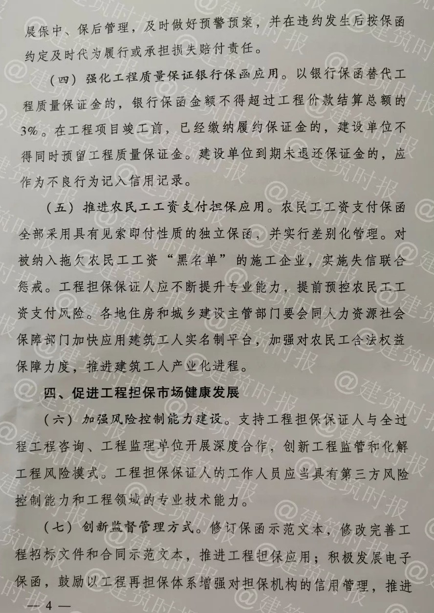 (四)强化工程质量保证银行保函应用。以银行保函替代工程质量保证金的,银行保函金额不得超过工程价款结算总额的3%。在工程项目竣工前,已经缴纳履约保证金的,建设单位不得同时预留工程质量保证金。建设单位到期未退还保证金的,应作为不良行为记入信用记录。