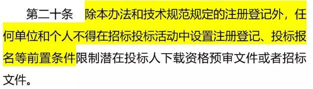 其实,在此之前,国家发改委和住建部等八部委公布的第20号令《电子招标投标办法》中,就明确规定:除本办法和技术规范规定的注册登记外,任何单位和个人不得在招标投标活动中设置注册登记、投标报名等前置条件,限制潜在投标人下载资格预审文件或者招标文件。