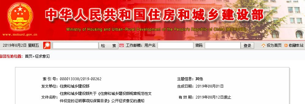 近日,住房和城乡建设部根据《国务院办公厅关于做好证明事项清理工作的通知》(国办发〔2018〕47号)及司法部相关文件要求,对证明事项进行了清理,形成了《住房和城乡建设部规章规范性文件设定的证明事项拟保留目录》,面向社会公开征求意见。