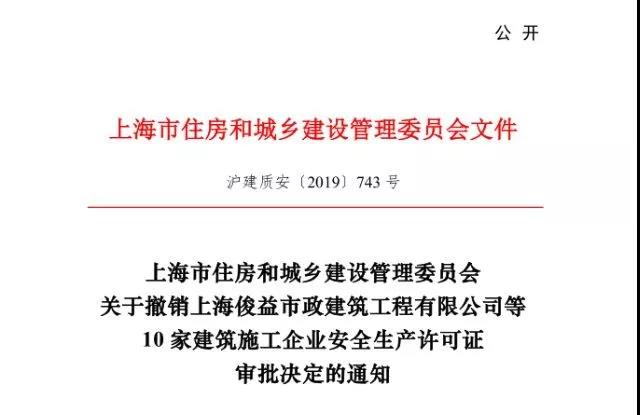 依据《上海市行政审批告知承诺管理办法》的相关规定,市住建委根据《关于本市建筑施工企业安全生产许可证实施告知承诺电子化审批的通知》(沪建质安〔2018〕623号),核查本市建筑施工企业。经查,10家企业在建筑施工企业安全生产许可证实施告知承诺审批过程中,存在虚假申报“三类人员”配置或所提交的承诺材料不符合要求等情况。现决定撤销该10家企业安全生产许可证审批决定。