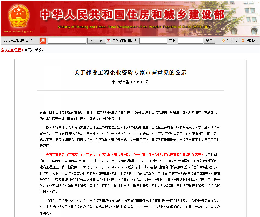 2019年1月31日,住房和城乡建设部公布了《关于建设工程企业资质专家审查意见的公示》(建办受理函〔2019〕2号)